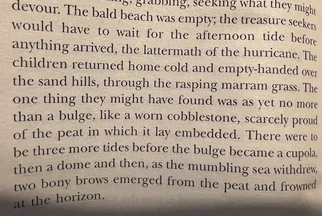 “lattermath of the hurricane” feels like it should jar, but it doesn’t. The dictionary definition refers to the second mowing of a crop. Jan has used it to detail something buried in the sand, “scarcely proud”, that would be further exposed once a second tide had ebbed and flowed. Here is the full paragraph is all its glory.